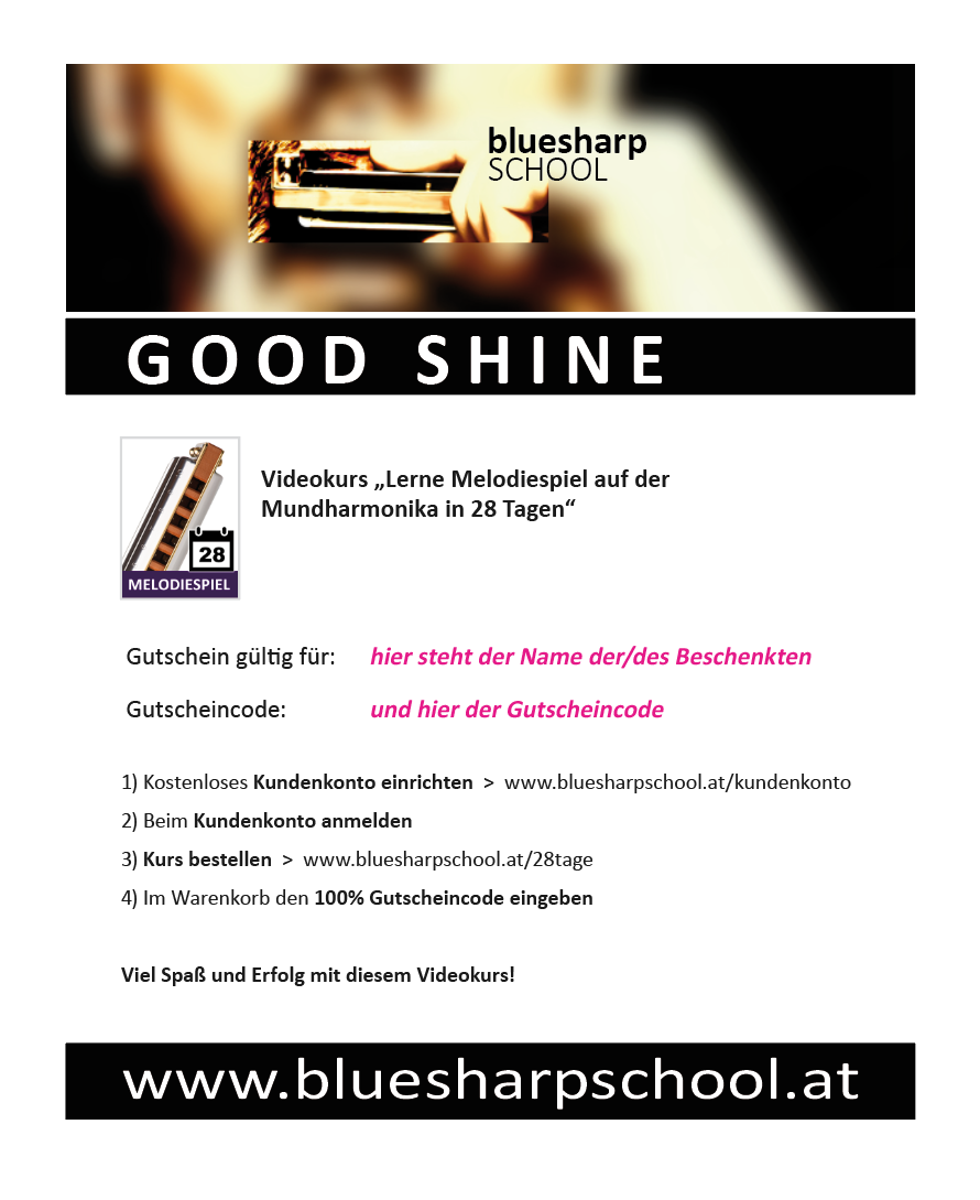 Das perfekte Geschenk für MusikliebhaberInnen: Ein Gutschein für den Video-Kurs „Lerne Melodiespiel auf der Mundharmonika in 28 Tagen“.