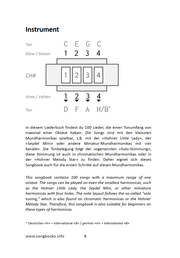 Alle Lieder in diesem Buch haben einen Tonumfang von maximal einer Oktave, also 8 Töne – „Only 8“. Somit lassen sie sich wunderbar mit den kleinsten Mini- Mundharmonikas mit vier Kanälen spielen – zum Beispiel mit der „Hohner Little Lady“ oder der „Seydel Mini“.